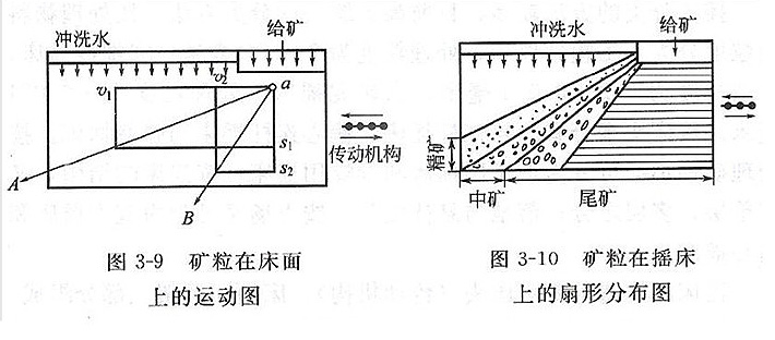 摇床是用于选别细粒矿料的重力选矿设备。 摇床的选矿过程是在具有来复条的床面上进行的,矿粒群从床面上角的给矿槽送入,同时由给水槽供给横向冲洗水,于是矿粒在重力,横向流水冲力,摇床床面作往复不对称运动所产生的惯性和磨擦力的作用下,按比重和粒度分层,并沿摇床床面做纵向运动和沿倾斜床面做横向运动。因此比重和粒度不同的矿粒沿着各自的运动方向逐渐沿对角线呈扇形流下,分别从精矿端和尾矿侧的不同区排出,然后被分成精矿,中矿和尾矿。